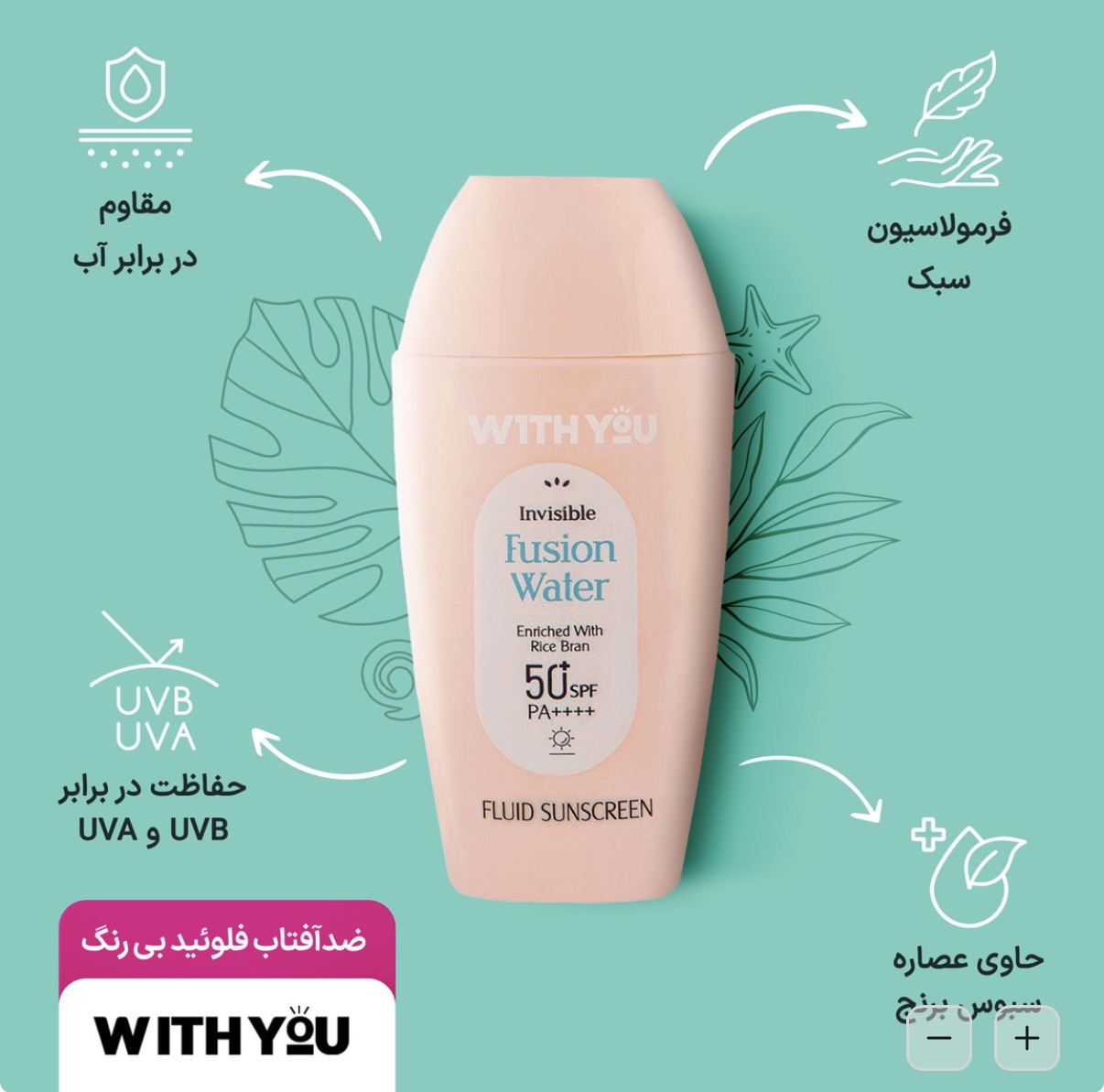 نام محصول: فلوئید ضدآفتاب فیوژن واتر SPF50 بی رنگ ویت یو