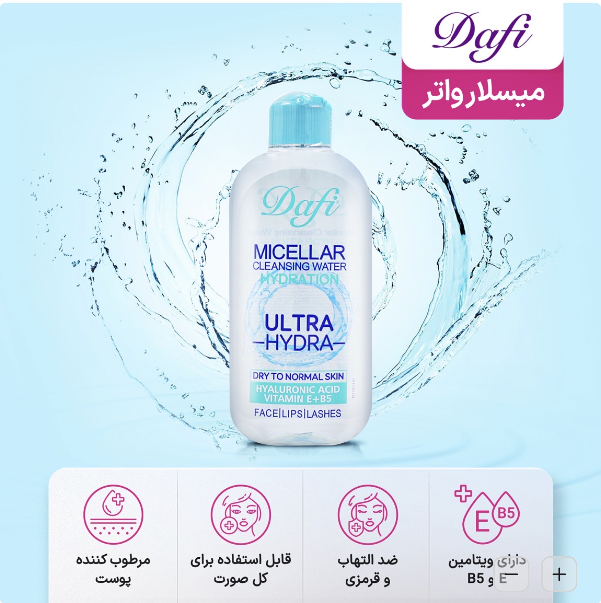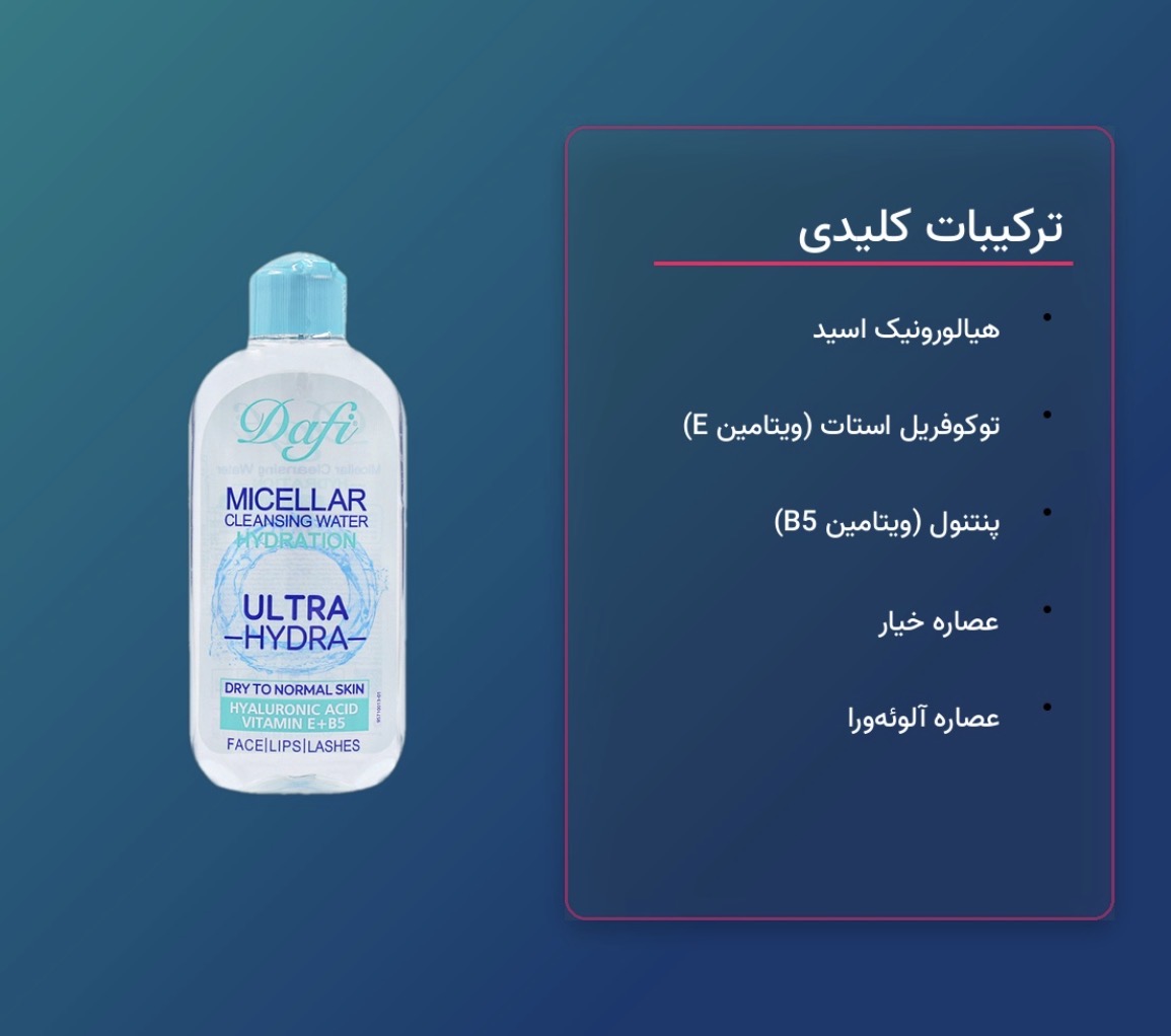 میسلار واتر دافی ویژه پوستهای خشک تا نرمال، آرایش روزانه و آلودگی را به نرمی پاک میکند و احساس طراوت میدهد. ترکیب هیالورونیک اسید و ویتامینهای E و B5 به حفظ رطوبت و تقویت سد دفاعی پوست کمک میکند و حس کشیدگی را کم میکند. بعد از پاکسازی، صورت برای ادامه مراحل مراقبت آماده است.